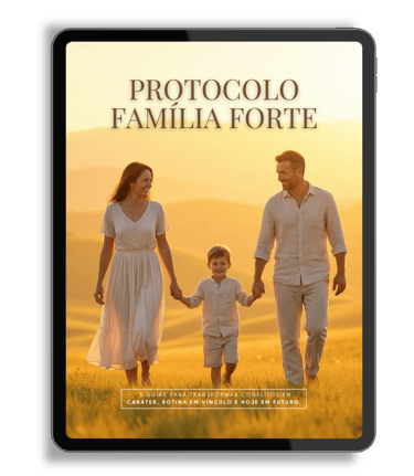 A Protocolo Família Forte reúne 5 guias práticos que te mostram, passo a passo, como reduzir brigas, falar uma vez só, criar conexão de verdade e preparar seus filhos para o futuro usando o dia a dia que você já tem.